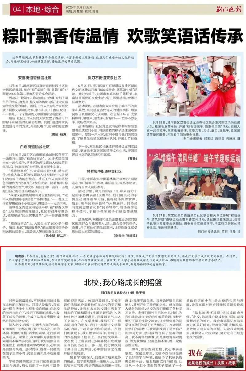 青春校园,青春力量!荆门市龙泉北校,一个充满青春活力与朝气的校园!这里,不仅是广大学子梦想发芽的沃土,亦是广大学子成长蜕变的摇篮。在这里,广大学子于课堂汲取知识养分,在活动中突破自我,在挫折里收获坚韧。在这里,广大学子的每段或深或浅的成长经历,都镌刻成独特的不可磨灭的青春印记。