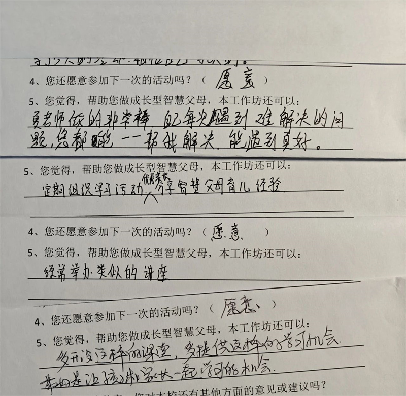 活动结束后,家长们认真填写了智慧父母成长工作坊效果反馈表。反馈结果显示,所有家长都表示愿意成为成长型智慧父母。他们宛如一群渴望知识的学子,在家庭教育的道路上,迈出了坚定而有力的步伐。家长们希望学校能多组织此类活动,同时期待学校多宣传一些正面成功的教育案例,以便他们能够从中汲取经验,更好地教育孩子。这些反馈宛如一面面镜子,映照出工作室活动的成功与家长们对教育的热忱。